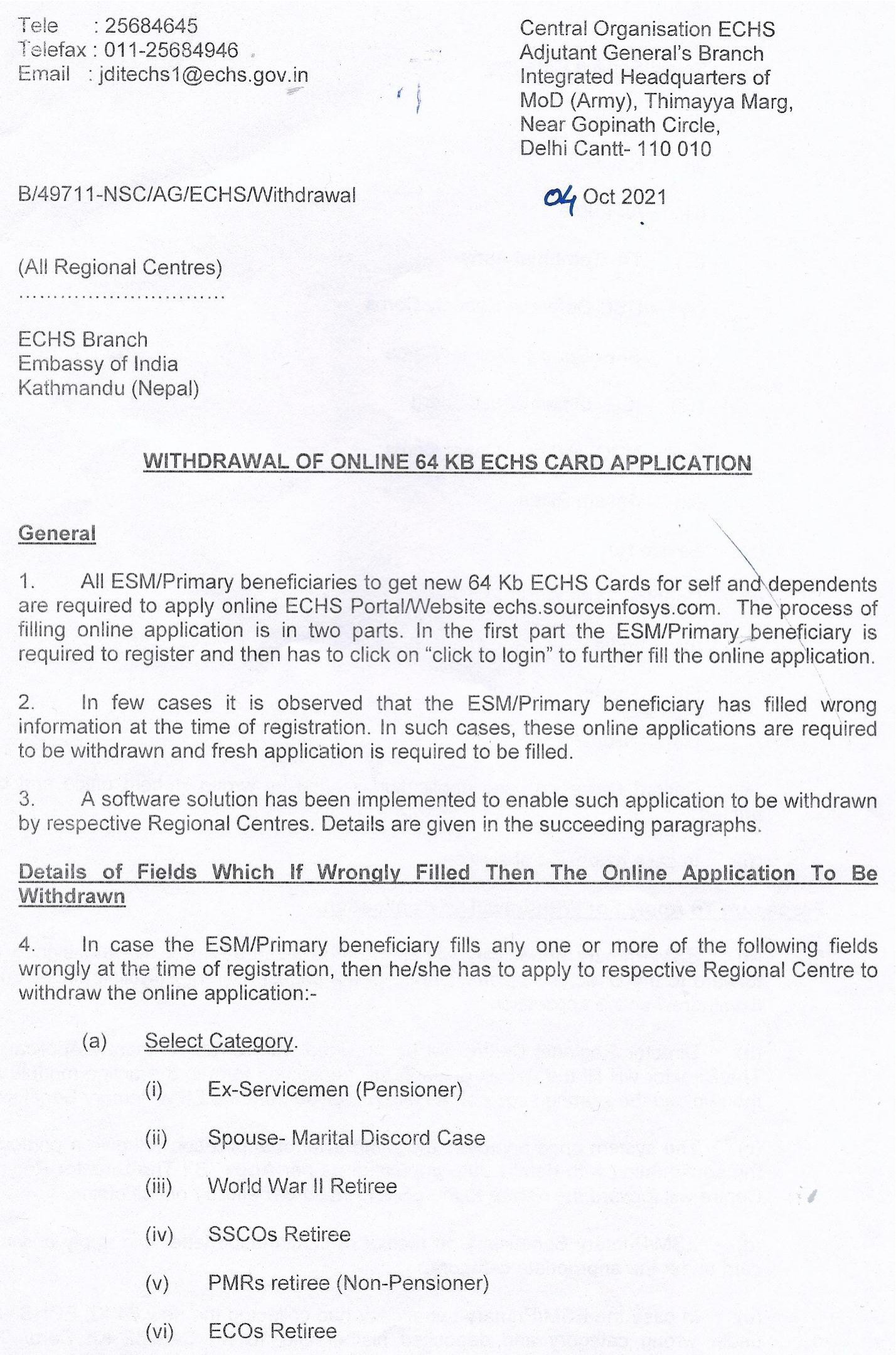 Withdrawal of online 64 kb echs card application dated 04-oct-2021